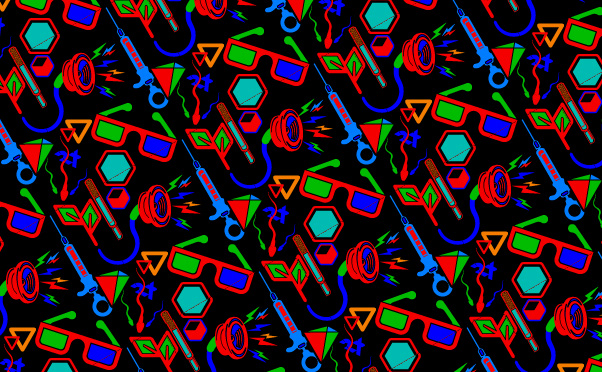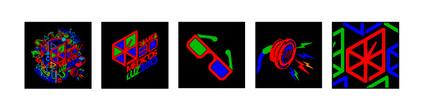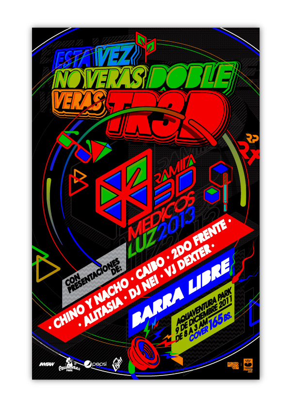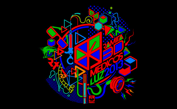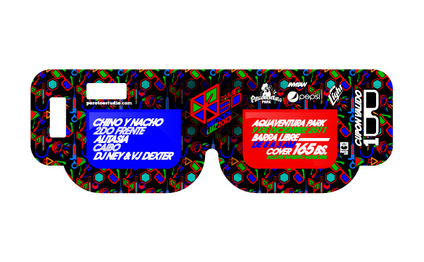 Diseño para fiesta temática 3D de tipo chromadepth, cada piezas se diseñó en función del comportamiento del color ante los lentes especializados / Design for 3D themed party chromadepth type, each piece was designed based on the behavior of specialized lenses buff