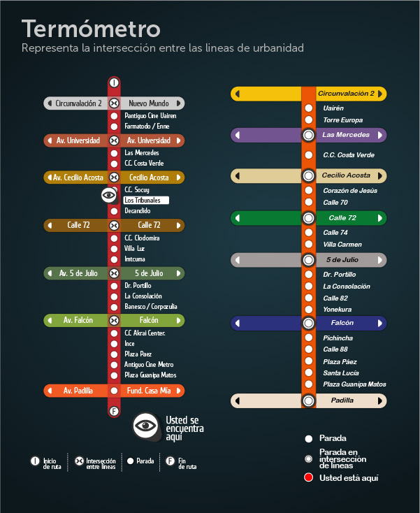 Aplicación del color; la apariencia de la marca cambia según la linea de urbanidad que representa. Cada línea de Urbanidad posee un color que la caracteriza dentro del contexto del proyecto